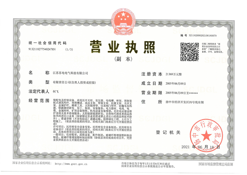 江蘇蘇電電氣科技有限公司是一家集制造、經營、服務于一體的綜合性企業。成立于2005年6月9日,注冊資金21369萬元,現有職工186人,其中高級工程師3人 ,工程師15人,各類專業技術人員28人,年銷售額3億多,是揚中市開發區三十強企業之一。 公司立足于電器領域,形成了多元化的發展格局。憑借優秀的團隊、精良的設備、優勢的技術和高效的管理,專業生產高低壓開關柜、母線槽、抗震支架、管廊支架、成品支架、光伏支架、電纜橋架等。在供配電、大型建筑、市政工程、光伏發電等領域享有較有高的聲譽。 公司始終秉承“求實、創新、和諧、共贏”的發展主題,進行了一系列變革,優化資源配置,搭建了高效發展的平臺。公司較早地采用了CAD電腦輔助系統,擁有數控加工中心。產品被青島新機場、江蘇省電力公司、湖北省電... ...
